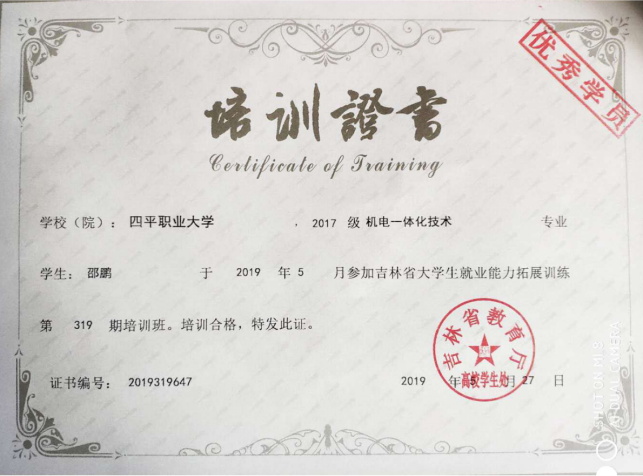 5月22日到27日,我院17级机电班邵鹏、田宝鑫、孙立峥、翟冠哲四名学生参加了由省大学生就业指导中心组织的“吉林省就业能力提升培训班”,进行了为期5天的封闭培训。此次就业能力提升培训内容主要包括就业指导、面试礼仪、拓展训练、能力提升、面试技巧等方面的技能。培训授课教师均为省就业指导中心严格遴选、集中培训的骨干教师。通过灵活实用的课堂教学,使参训学生在掌握课程知识的基础上,了解更多就业实战技巧,能力得到了进一步的提升。