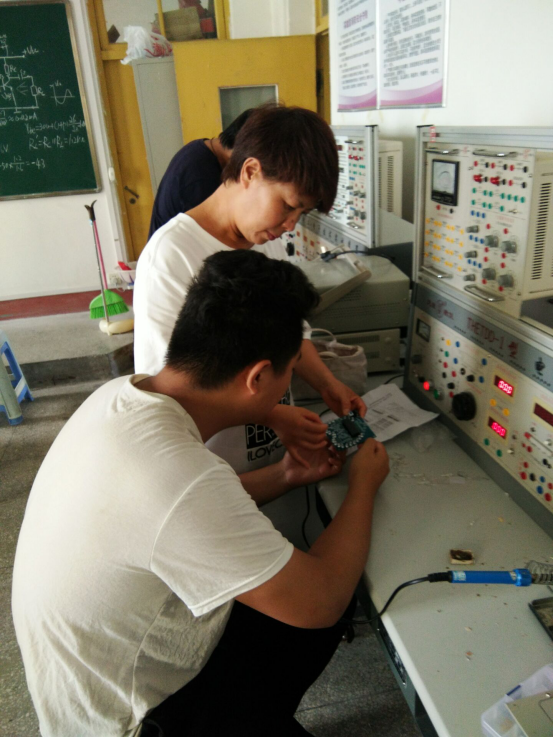 在电子实训室,电子信息专业学生在张四华老师的指导下,熟悉了手工焊接常用工具的使用及其维护,能够独立的完成简单电子产品的安装与焊接。对于常用电子器件的类别、型号、规格、性能及其使用范围,也有了更深刻的认识。同时,学生们也认识到,自己的理论知识和动手设计能力有待提高。