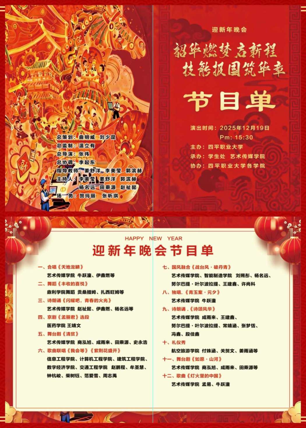 “韶华燃梦启新程,技能报国筑华章”,岁末冬寒,四平职业大学校园内暖意融融、喜庆盎然,处处洋溢着辞旧迎新的浓厚氛围。12月19日,由四平职业大学主办,艺术传媒学院与学生处联合承办、各学院鼎力协办的“韶华燃梦启新程 技能报国筑华章”迎新年文艺演出,在实训楼大厅盛大启幕、圆满落幕。此次演出以艺术为媒,紧扣时代主旋律,既展现了新时代青年学子的青春风采与报国之志,更集中彰显了学院艺术教育的扎实成果与办学风采,为全校师生献上了一场兼具思想深度与艺术美感的视听盛宴。