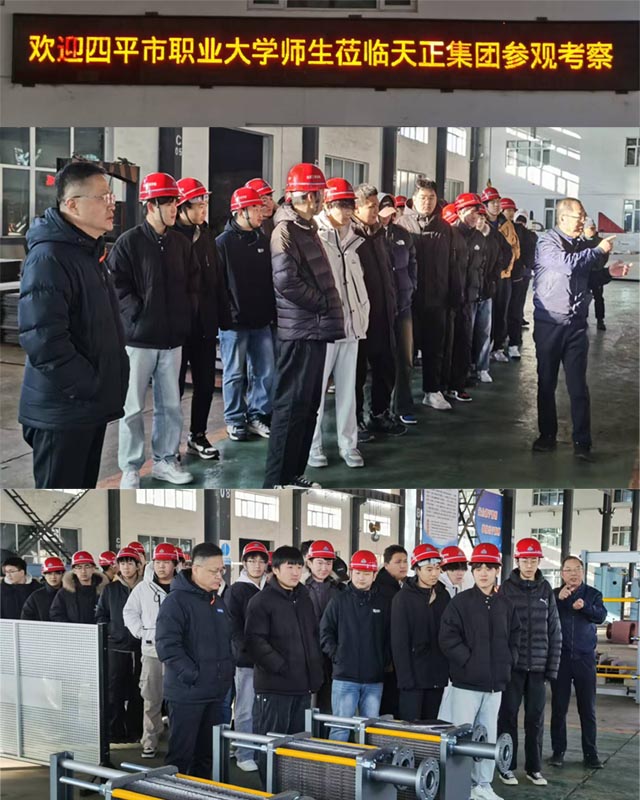 天正集团秉承用户至上,合作共赢的理念,为用户提供快速的服务,竭力打造绿色生活,为社会奉献清洁能源。四平天正换热设备有限公司一直致力于对换热设备、管道补偿设备等系列产品的技术创新和品质提升。企业紧紧把握时代脉搏,依托市级企业技术中心,加强与国内外知名科研机构的战略合作,积极构建“产、学、研”一体化科技创新体系。 12月2日,智能制造工程学院院长赵宇、教学副院长陈乃峰、院办刘天宇老师带领2024级电气自动专业班同学赴四平天正换热设备有限公司开展校企交流与合作探讨,受到公司负责人热情接待。